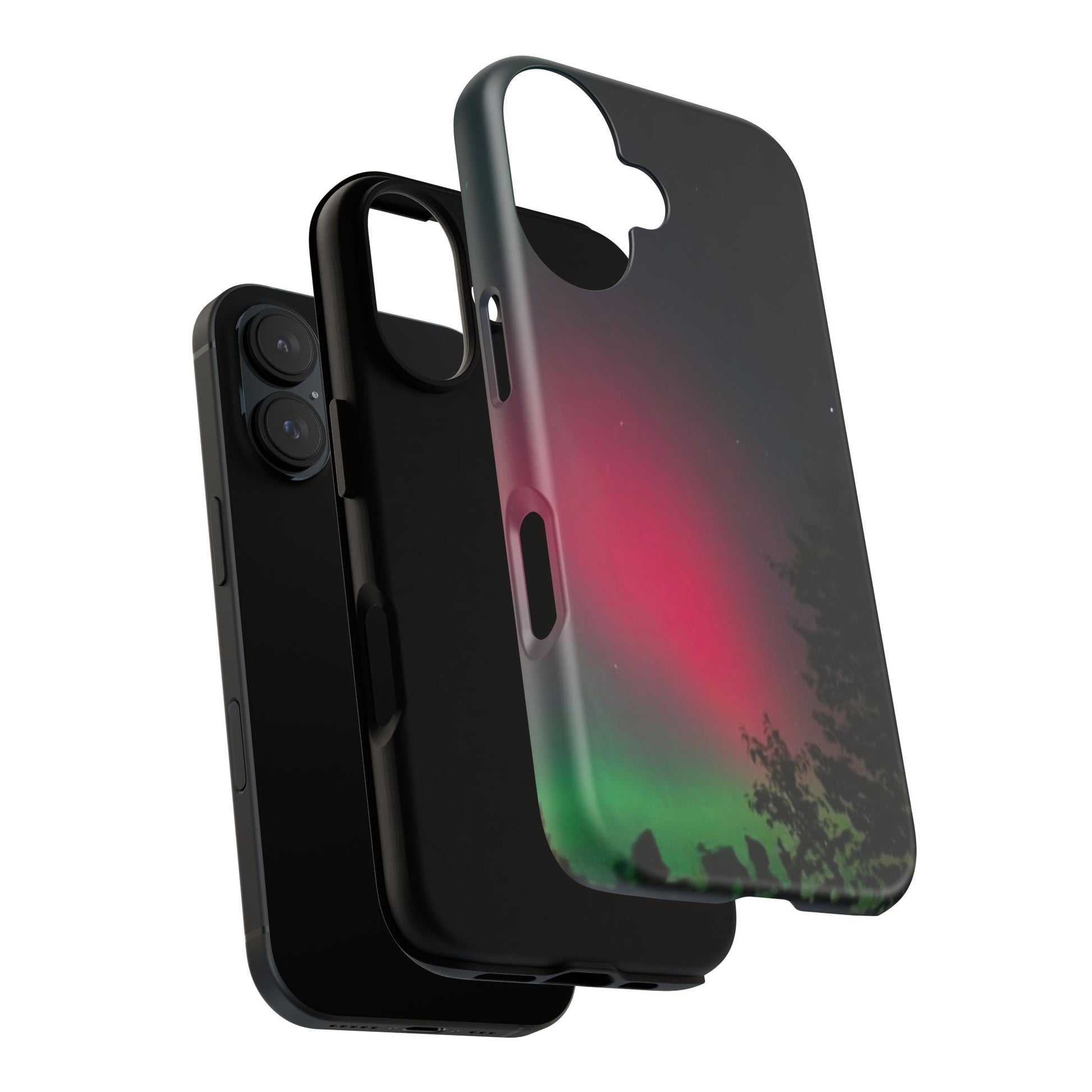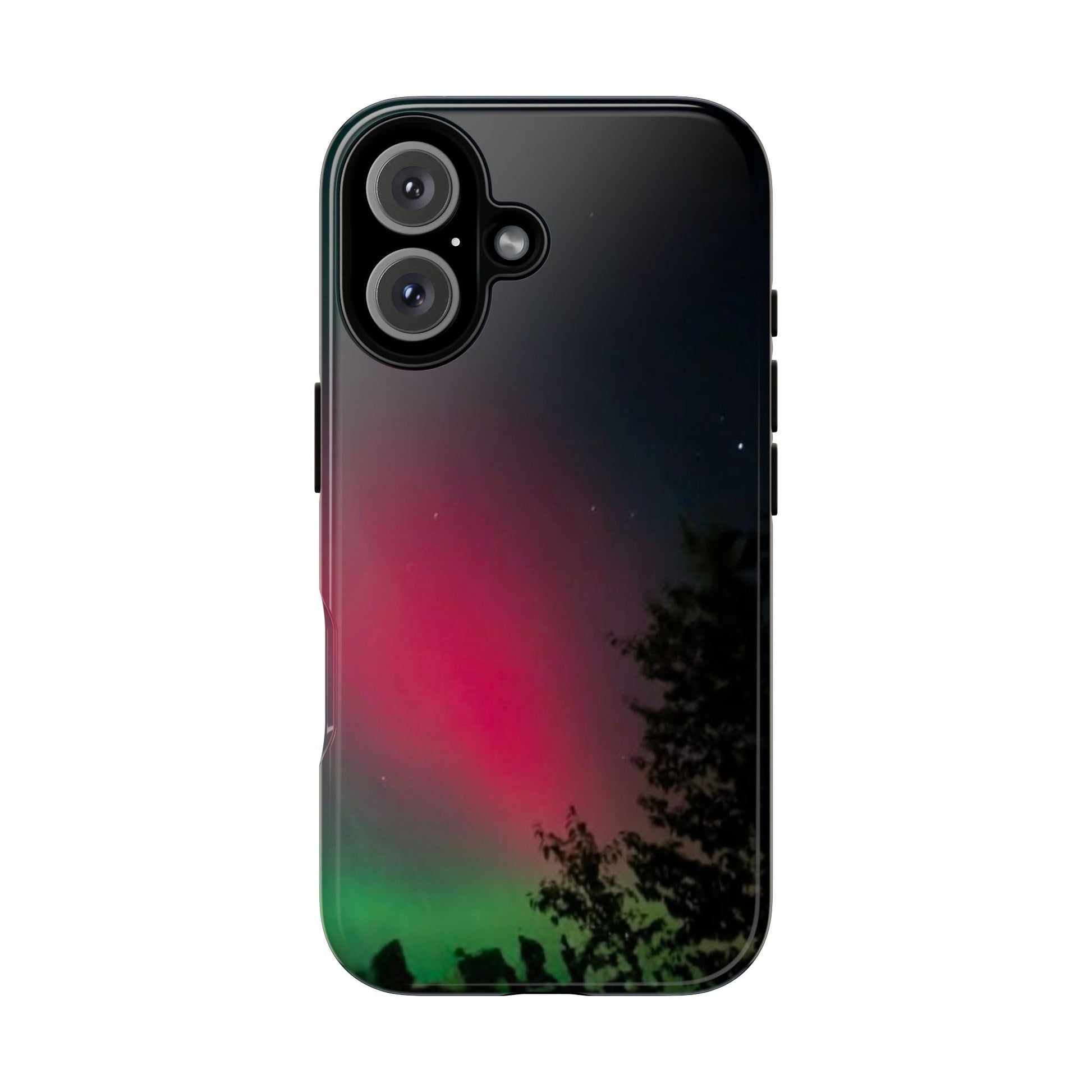 This slim dual-layer phone case brings the northern lights to your pocket — a glossy/matte shell with deep magenta and emerald gradients that fade into silhouetted treetops. The 3D wrap print carries rich, full-ink color edge-to-edge while a soft TPU silicone liner cushions against drops. Lightweight but shock-resistant, it keeps ports accessible and supports wireless charging. Built and certified to strict safety standards, it wears well outdoors with UV protection and gives a polished, tactile finish that feels as good as it looks.