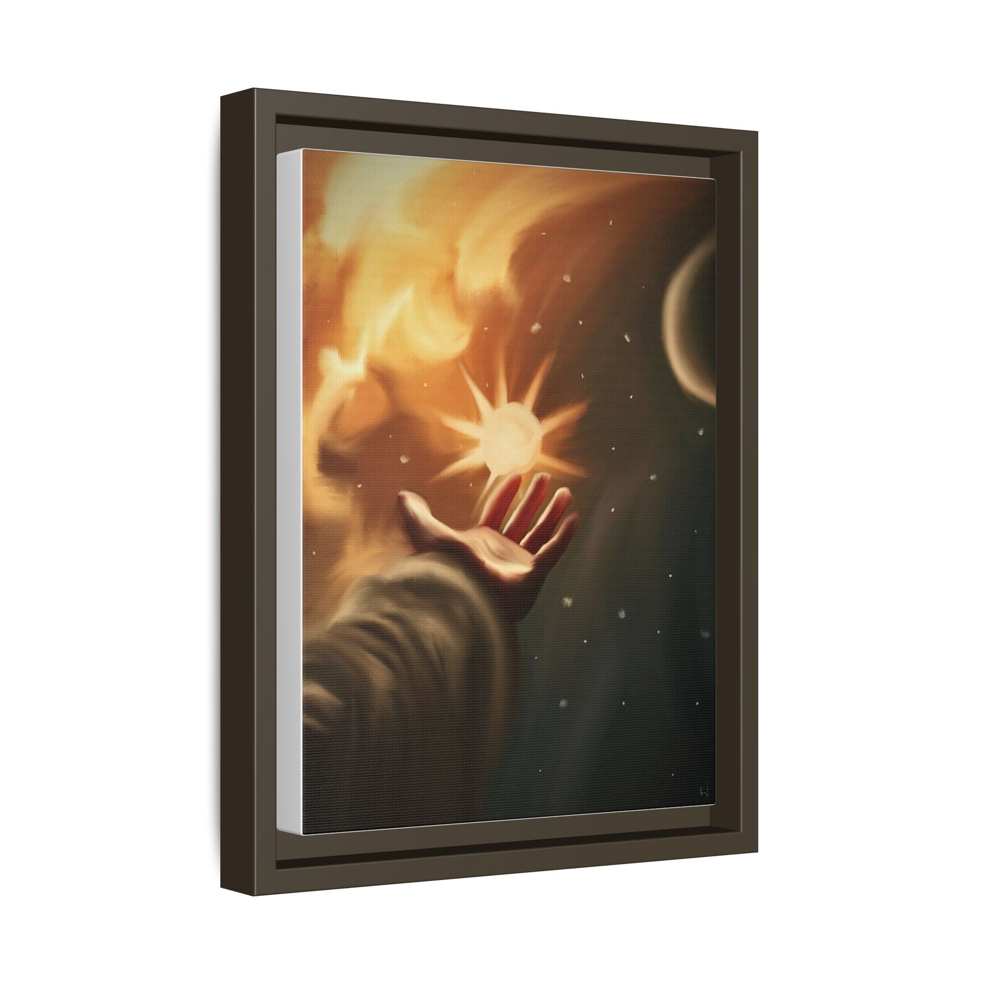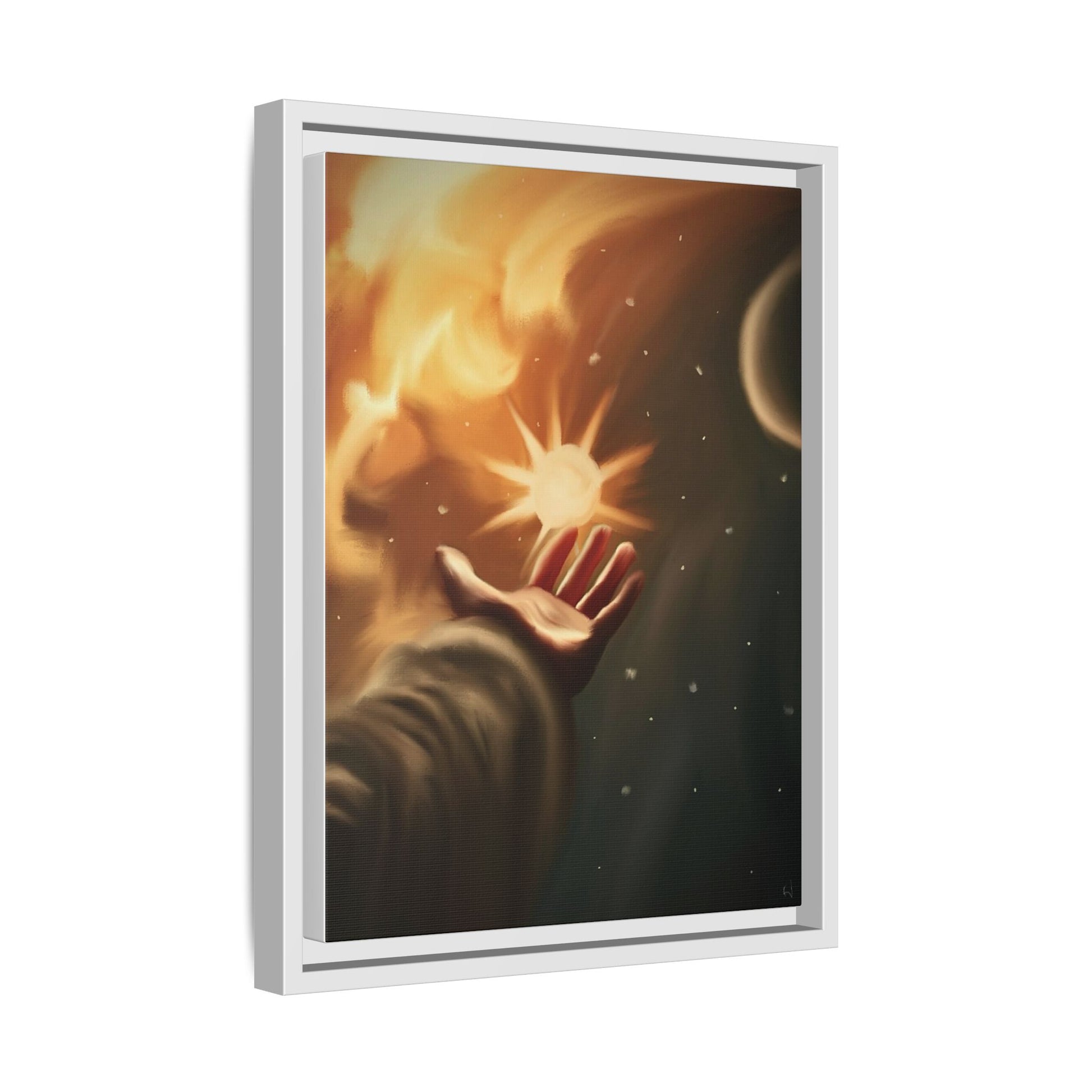 A framed matte canvas that reads like a moment suspended between worlds. Warm, painterly light spills from a small sun held in a reaching hand, surrounded by soft nebulae and a distant crescent—an artwork that invites quiet wonder and late-night reflection. The deep black frame and generous white mat give the image room to breathe on the wall, turning it into a focal point without shouting. It settles into living rooms, reading nooks, and creative studios, adding an intimate, contemplative presence that complements earthy, modern, and minimalist interiors.