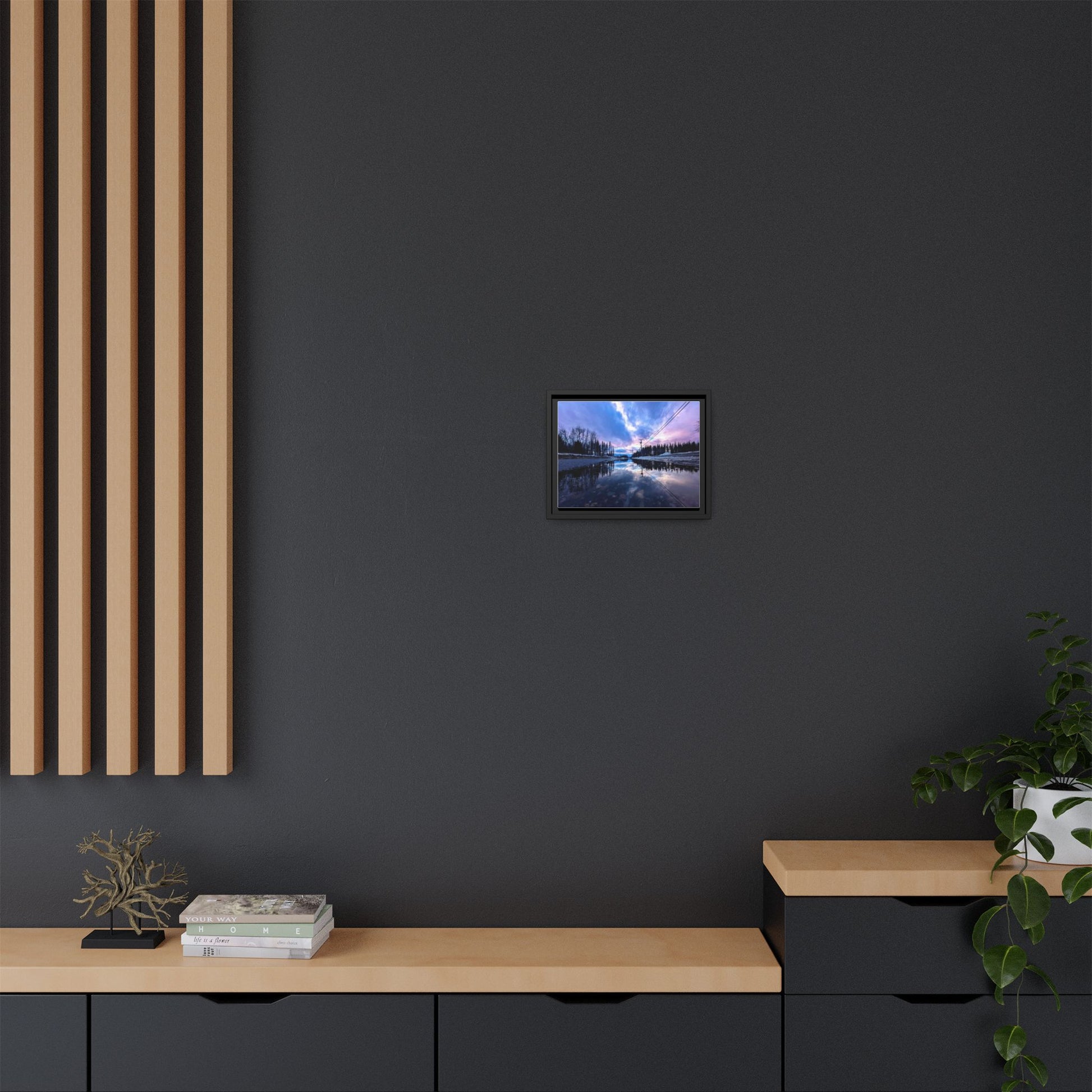 This framed matte canvas brings a quiet, reflective moment into a room — a winter evening sky melting into a mirrored river, softened by deep blues and pale mauves. The slim black frame and muted matte finish keep the image intimate and museum-like, letting the scene sit calmly on a wall without glare. It settles into entryways, living rooms, or a home office and invites a long, slow look: the hush of trees, distant utility lines slicing the horizon, and the glassy water that doubles the color and light. For someone who collects landscapes or wants a contemplative accent, this piece reads like a remembered evening — subtle, durable, and responsibly made.