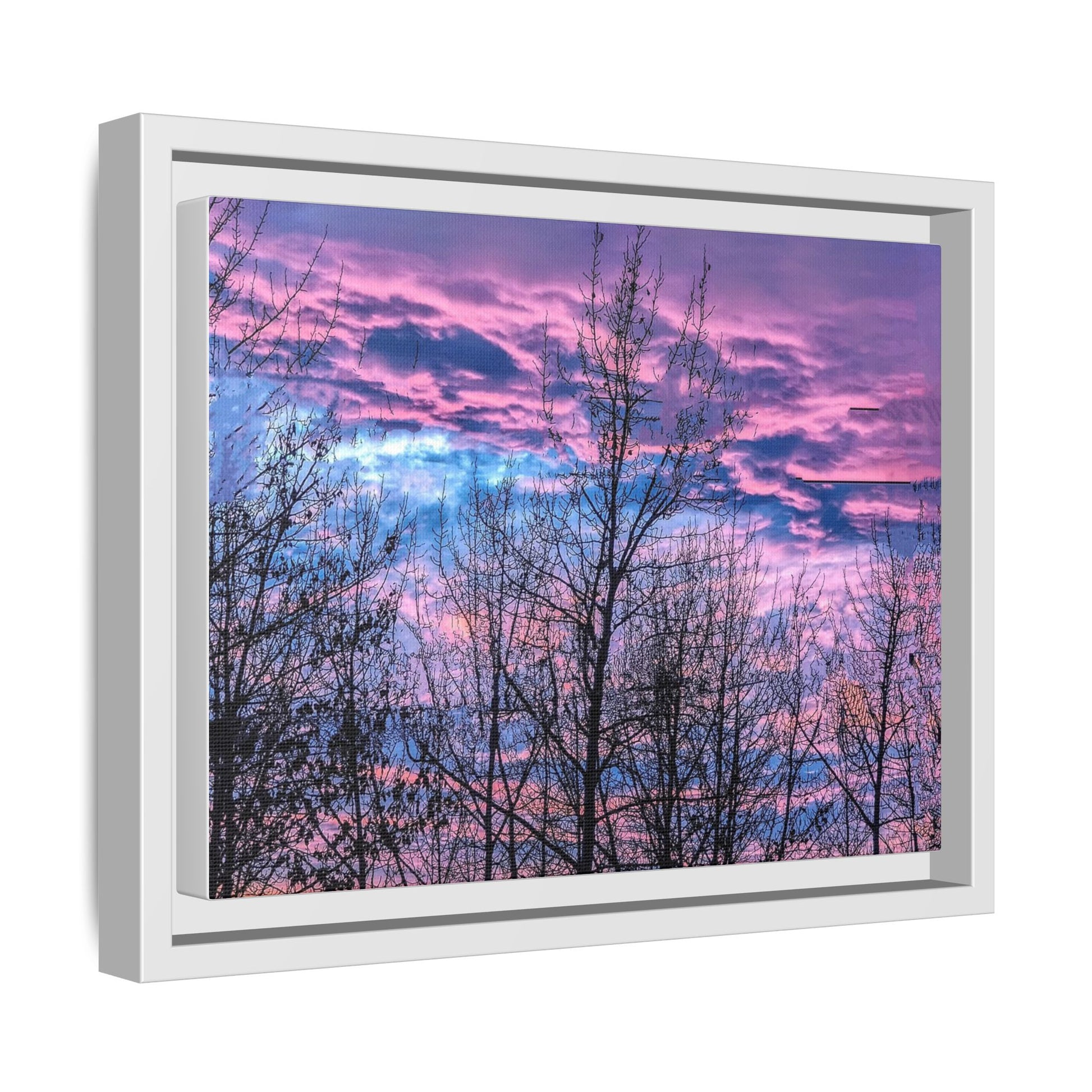 A framed matte canvas print that captures a fading winter sky in luminous pinks and soft twilight blues. Bare branches reach upward like ink sketches against the glowing clouds, creating a quiet, reflective scene that feels both intimate and expansive. The image is printed on a cotton-poly canvas composite with a proprietary coating for crisp detail and saturated color, then stretched over a smooth pine profile and set inside a sleek black frame. It hangs ready on the wall with sawtooth hardware and brings a tranquil, gallery-style finish to living rooms, hallways, or a cozy reading nook.