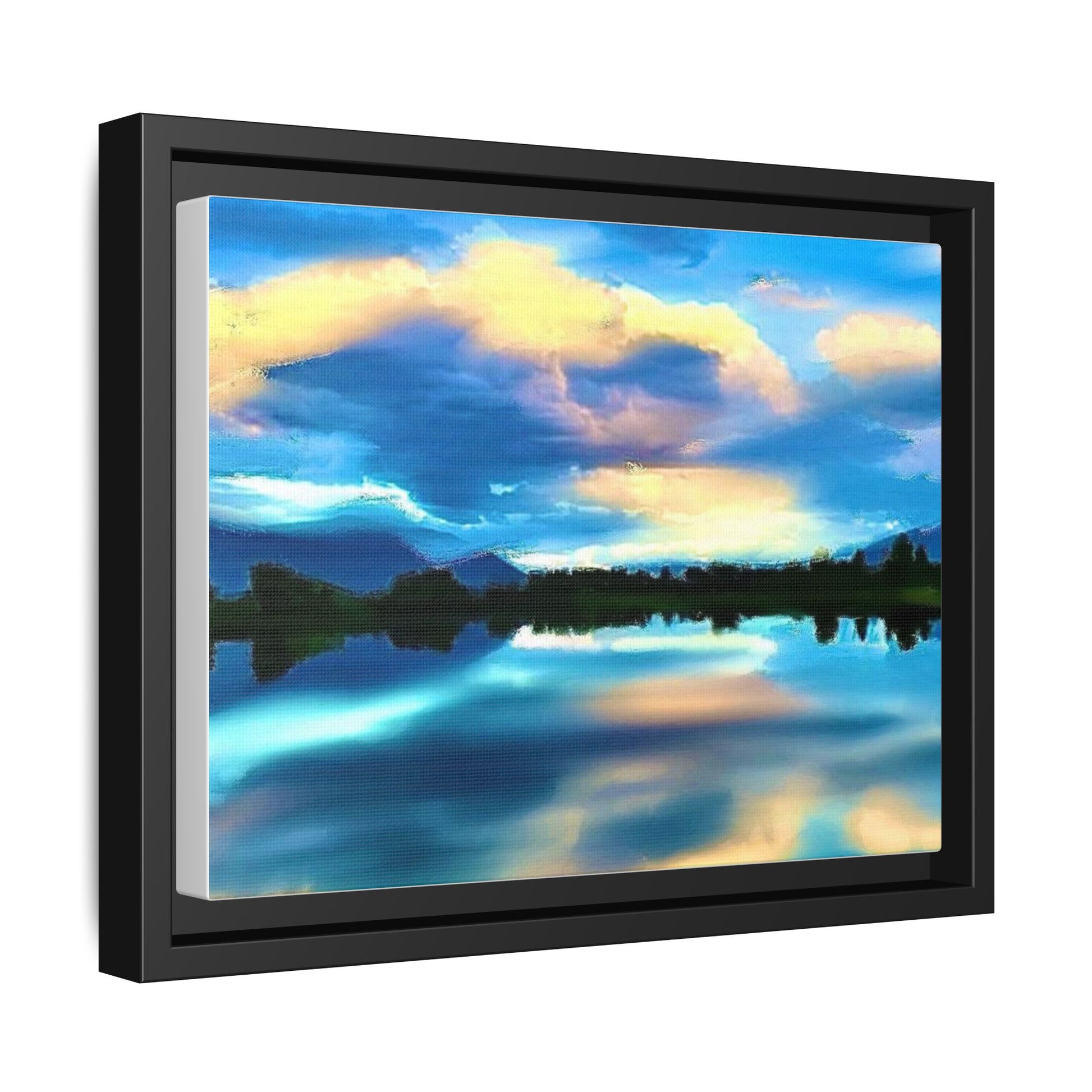 A matte canvas print framed in a sleek pine floater frame that brings a calm, luminous landscape into your room. The textured cotton-poly canvas and proprietary coating give the painted sky and mirrored water depth and subtle detail, while UL-certified Greenguard Gold latex inks keep the colors vivid and safe. Sustainably sourced pine stretcher bars and a durable sawtooth hanger make it simple to mount above a mantel, in a reading nook, or as the anchor piece in a serene gallery wall. The black floater frame creates a modern border that floats the art off the wall, letting the glow of blues and warm cloud tones breathe. This piece feels like a slow evening by the lake — quiet, reflective, and quietly elegant.