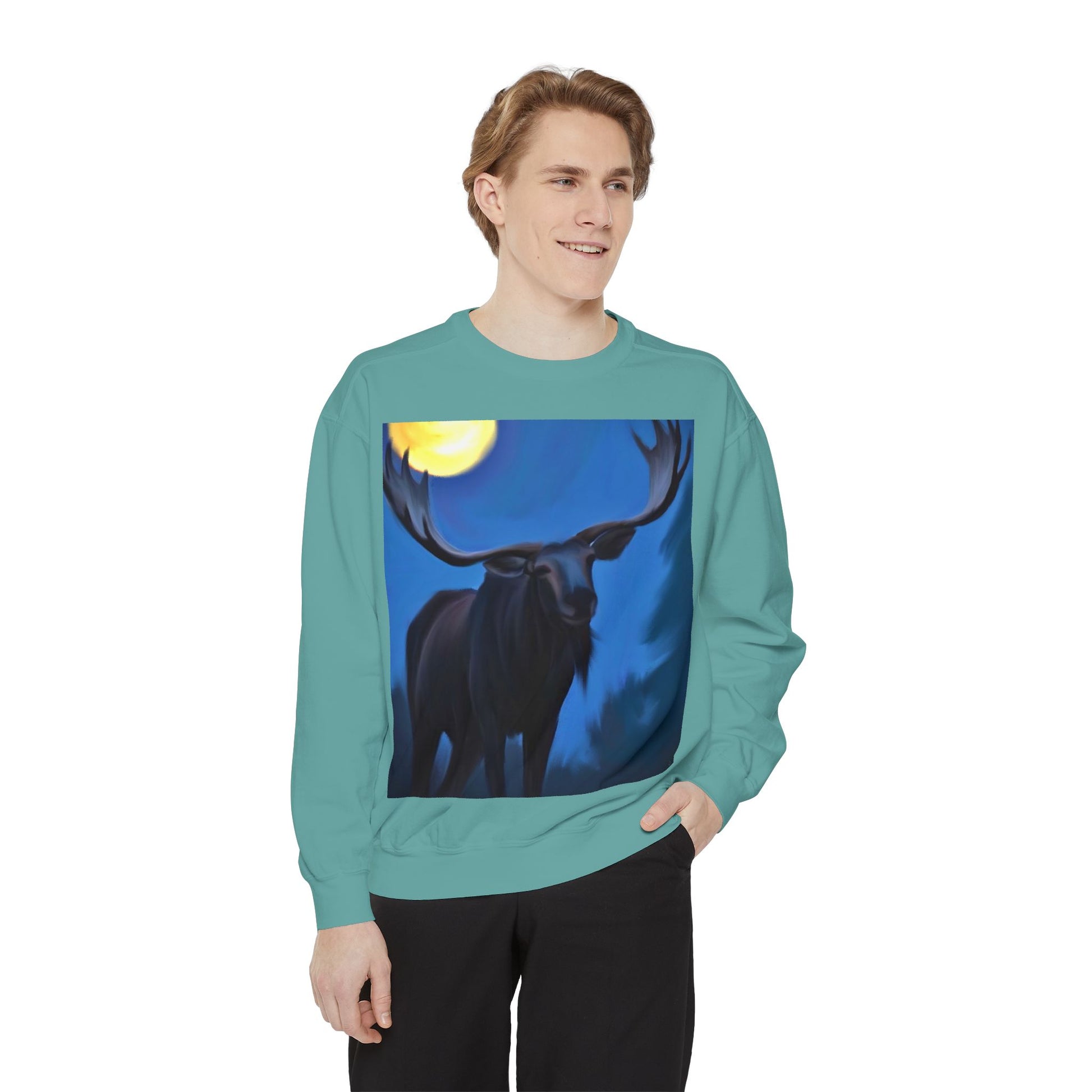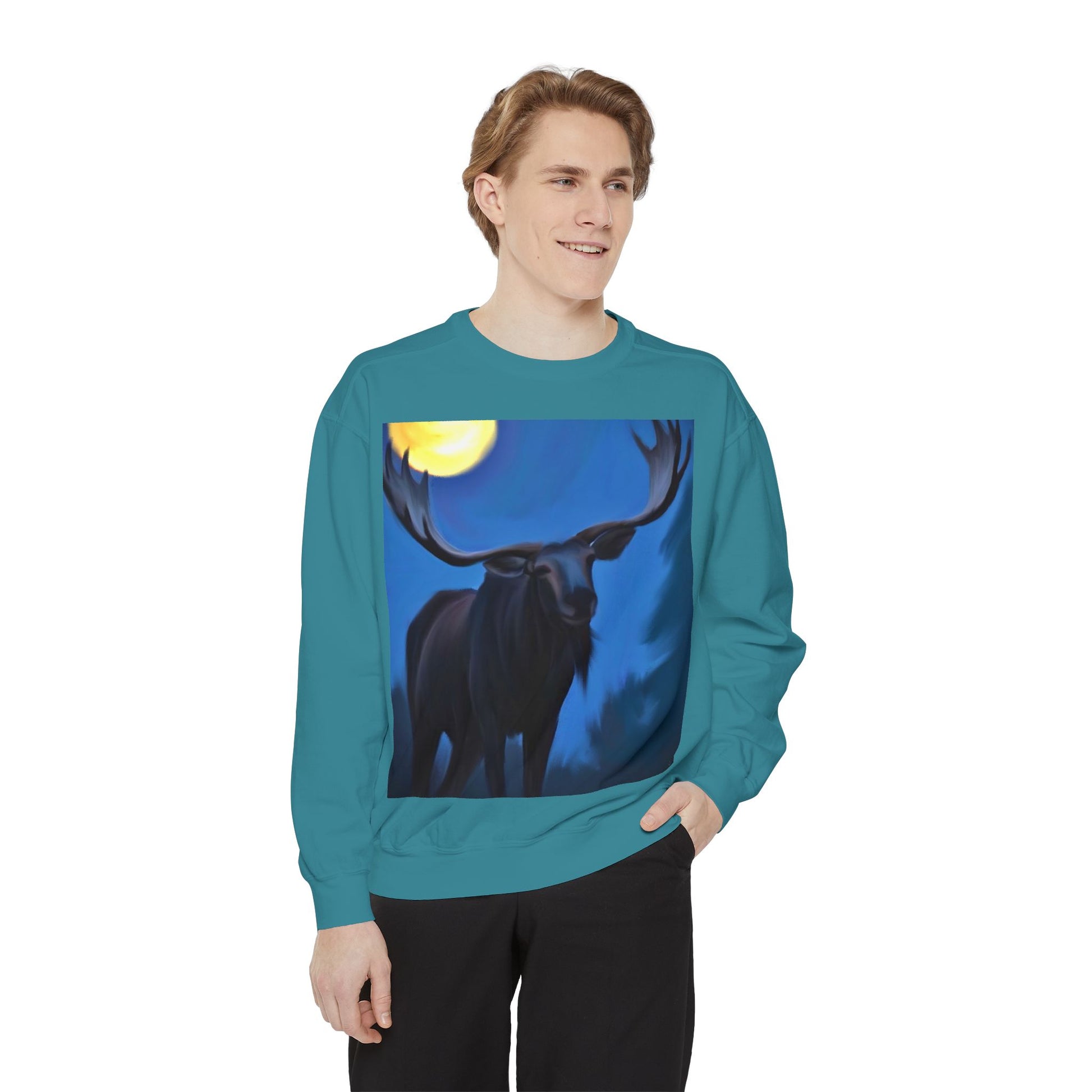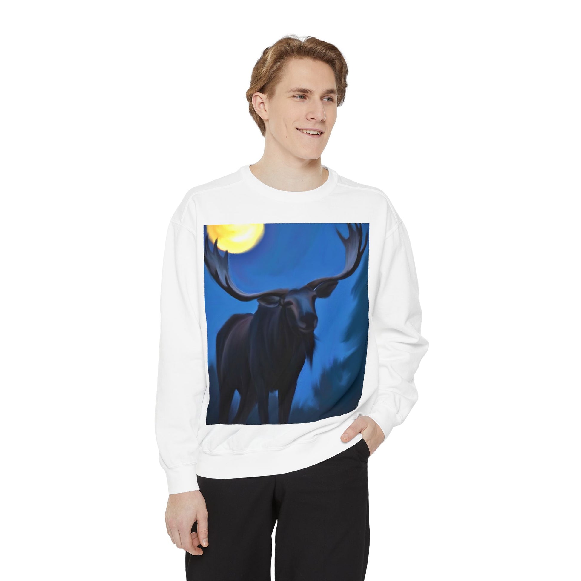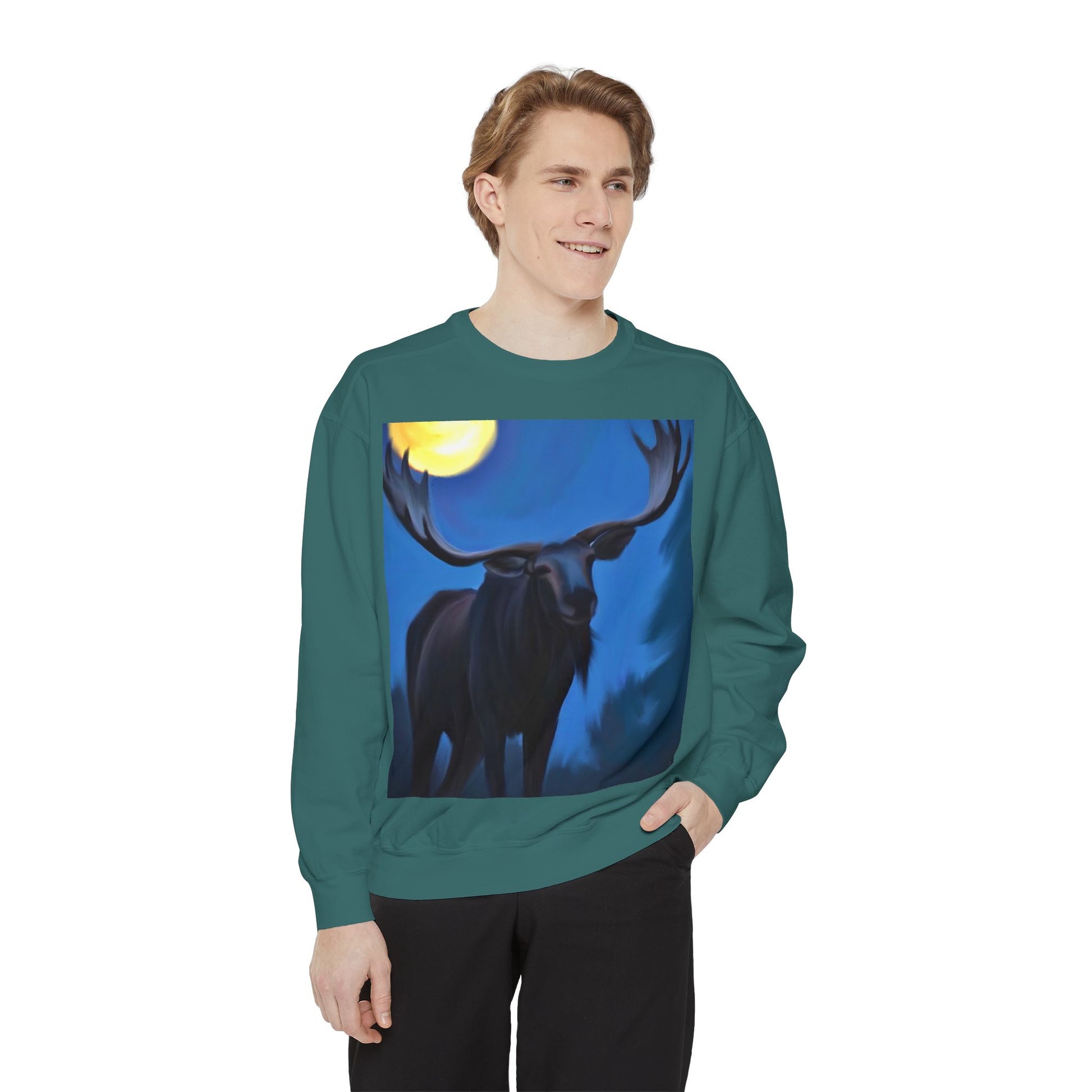 Slide into quiet nights and deep woods with this relaxed-fit garment dyed sweatshirt. A moose silhouette stands under a luminous moon — bold, calm, and a little wild. The medium-heavy ring-spun cotton blend feels substantial yet soft, and the ribbed collar, cuffs, and hem hold shape while letting you move freely. Necktape and a half-moon back patch give it a finished, comfortable fit that wears in, not out. Subtle OEKO‑TEX low-impact dyes and durable fabric make the print pop and last. Wear it on cool evenings after a trail walk, layered for cabin nights, or around a fire when the conversation slows and the sky opens.