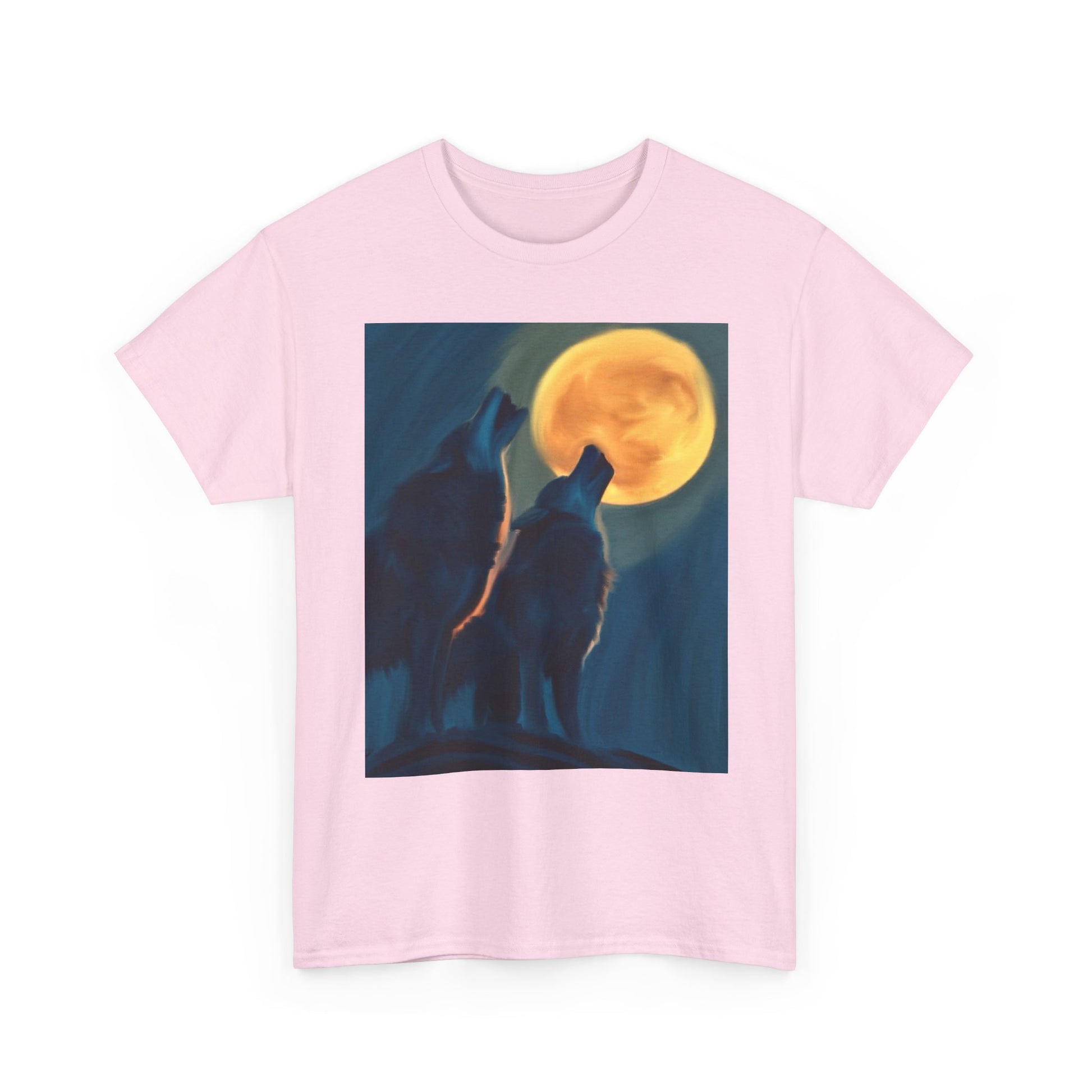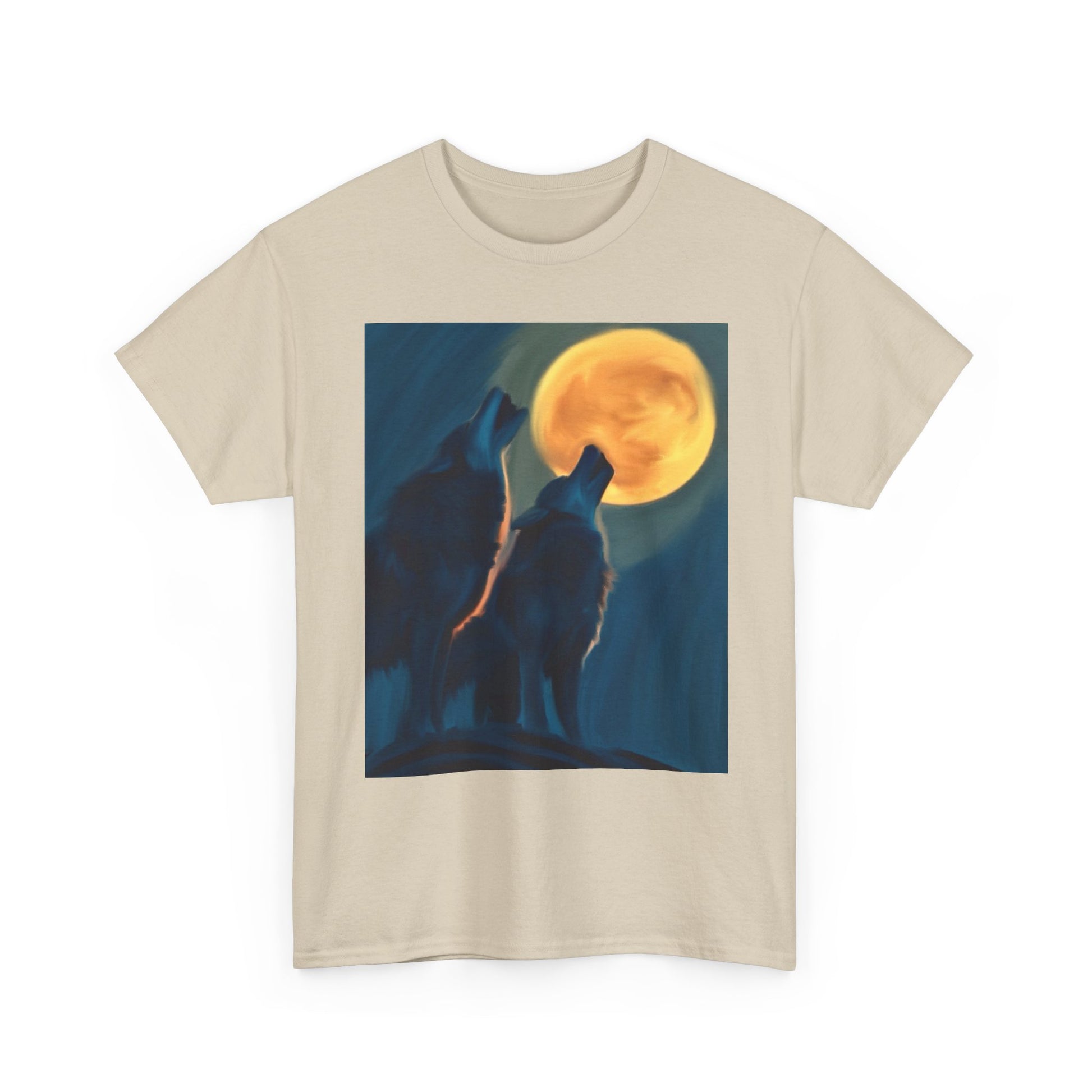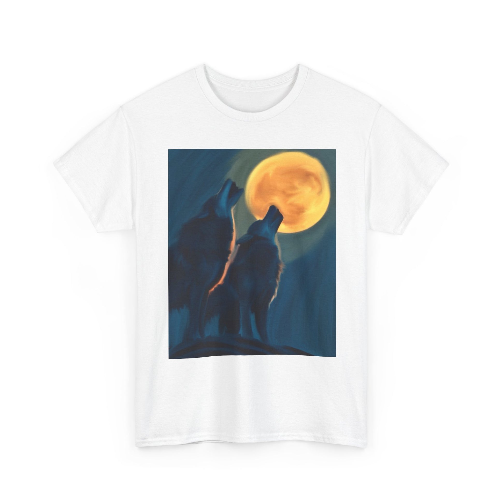 This classic cotton tee carries a quiet, wild energy — two wolves silhouetted against a glowing full moon, printed with rich, painterly tones that feel like a midnight campfire story. The soft, sturdy fabric drapes comfortably while the clear, detailed print keeps its depth wash after wash. Wear it on evening hikes, at boardgame nights, or when you want to bring a little wilderness to city life. The design reads like a memory: the hush of pines, the pull of the moon, the companionship of a kindred pack.